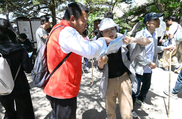 五一小長假,天柱山各級(jí)機(jī)構(gòu)主動(dòng)上山,志愿者在景區(qū)各個(gè)地方為游客排憂解難。在大龍窩索道游客中心,游客數(shù)量眾多,人頭攢動(dòng)。他們穿著志愿者服務(wù)的小馬褂,戴著紅色志愿者的服務(wù)帽,面對(duì)游客提出的各種問題,他們仔細(xì)傾聽,耐心解釋,始終保持微笑服務(wù)。遇見行動(dòng)不便和年紀(jì)偏大的游客,他們一邊提醒游客注意,一邊主動(dòng)上前攙扶。