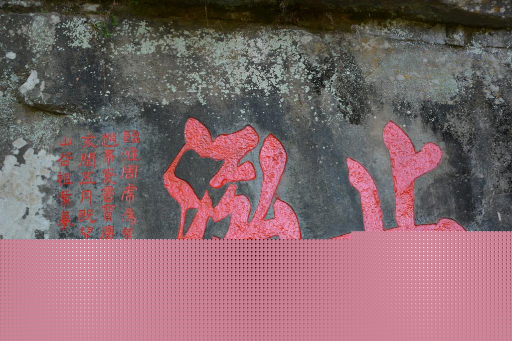 ? ?? 在琳瑯滿目的珍貴石刻中,有一副題刻尤為搶眼,那就是山谷流泉中段東側(cè)臨溪崖壁上“止泓”兩個(gè)摩窠大字。石刻全文如下:“止泓。 臨淮周虎為冀邸趙希袞書。寶慶丁亥閏五月既望,住山谷祖菄摹。”“止泓”二字為右起特大楷體橫書,雄渾矯健、雅秀遒勁、端莊清新、灑脫自如,實(shí)為書法藝術(shù)珍品;下款為右起4行隸體直書。